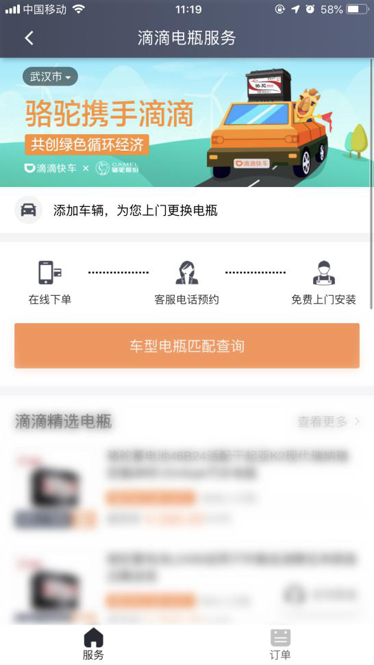 打开滴滴车主APP或小桔车服APP,除了车主们熟知的“小桔加油”和“小桔养车”之外,增设了新的服务——换电瓶,此业务均由骆驼集团提供产品供应及服务支持。车主们只需填写自己的车型信息,即可获取适配爱车的电瓶推荐,选择相应产品,在线完成下单,就可享受到极速上门安装服务。