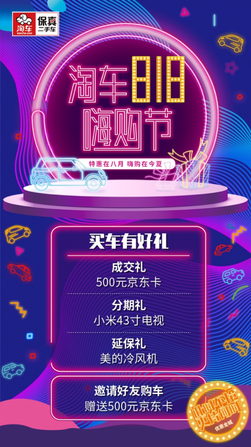 在线上线下全覆盖的同时,818 嗨购节更大的一个卖点是优惠力度强。淘车为“嗨购节”特别设置了成交礼、分期礼和延保礼等三重大礼方案。其一,消费者在淘车成交二手车就可获得500元京东卡;其二,以金融分期方式购车的客户可享受“礼上礼”,获赠小米43寸电视;其三,在淘车店完成购车交易并购买延保产品的客户,更可另外获赠美的冷风机。此外,淘车老客户介绍新客户到店购车,新老客户均可获得500元京东卡。(以上礼品数量有限,消费者先到先得。)