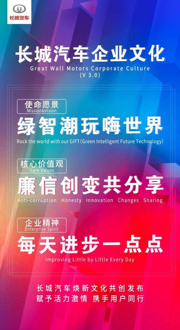 11月16日,以一场"只有21个字的发布会",和一封名为《以绿智 共潮玩 一起嗨世界 长城汽车焕新文化共创发布》的公开信,长城汽车正式对外公布了"绿智潮玩嗨世界 廉信创变共分享 每天进步一点点"的全新企业文化。