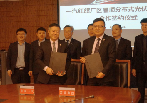 2019年3月21日下午,汉能薄膜发电集团(下文简称“汉能”)与中国第一汽车集团有限公司(下文简称“中国一汽”)签署分布式电站项目能源管理协议,双方将以“绿色节能”为主题开展合作,打造高端节能工业社区。