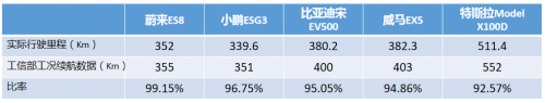 在超过400公里的续航挑战中,最终威马EX5满电实际续航为382.3公里、特斯拉Model X为511.4公里、蔚来ES8为352公里、小鹏G3为339.6公里、比亚迪宋EV500为380.2公里。按照工况占比计算(实际行驶里程/工信部工况续航数据)得出以下排名:蔚来ES8荣获第一名,小鹏ESG3、比亚迪宋EV500分列二三,然后则是威马EX5、特斯拉Model X100D。