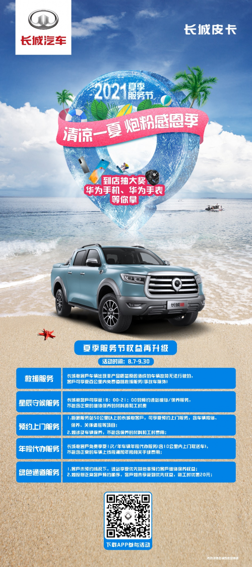 8月7日至9月30日,长城炮“清凉一夏 炮粉感恩季”夏季服务节权益再升级,推出“救援服务”、“星辰守候服务”、“预约上门服务”、“年检代办服务”、“绿色通道服务”等五大升级服务,全方位覆盖用车全生命周期,让用户的每一次出行都无后顾之忧。